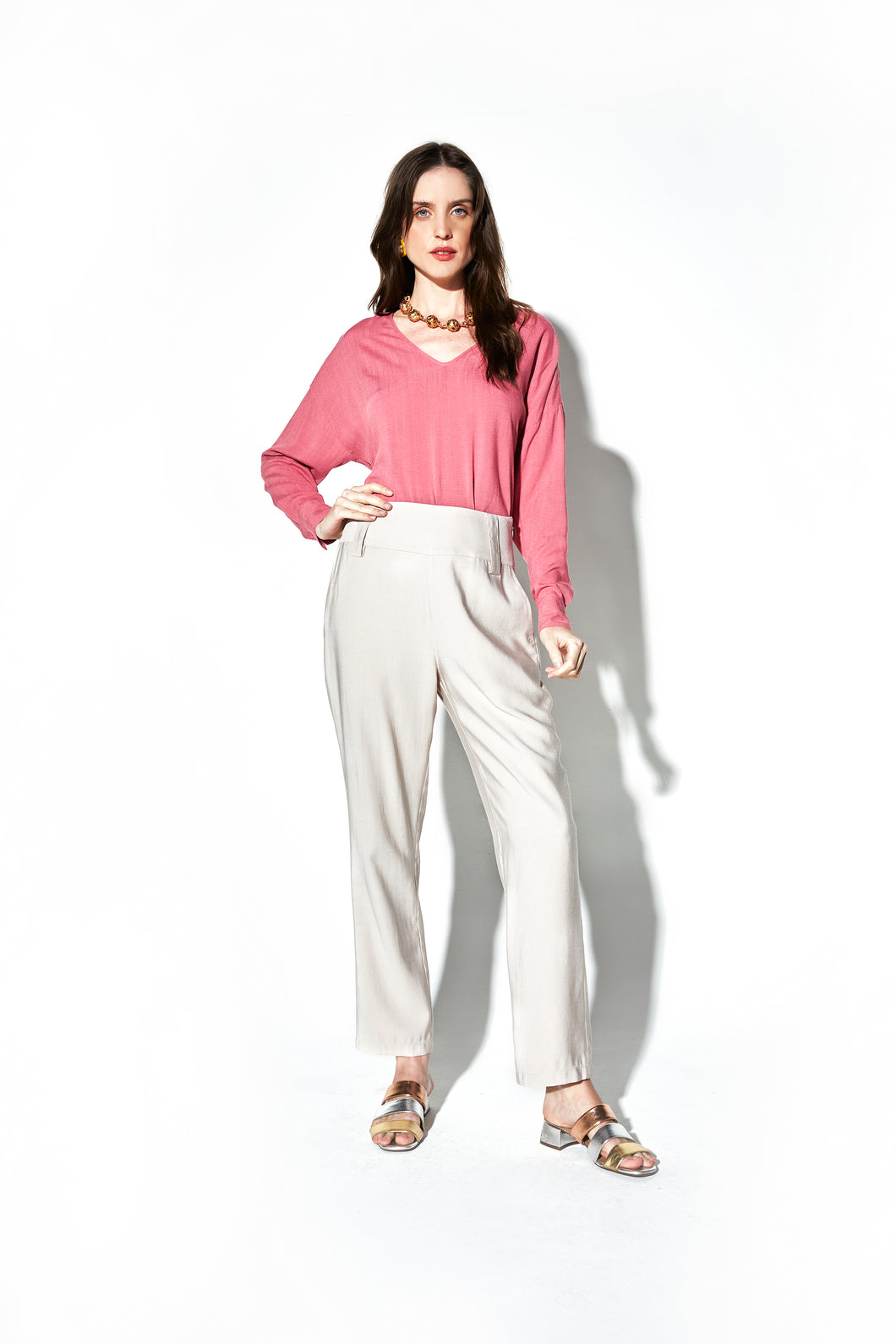 A Blusa Liana, confeccionada em viscose, possui decote "V", mangas compridas fechadas por botão nos punhos, caimento solto, barra arredondada assimétrica, mais comprida na parte posterior e pequeno recorte nas laterais.