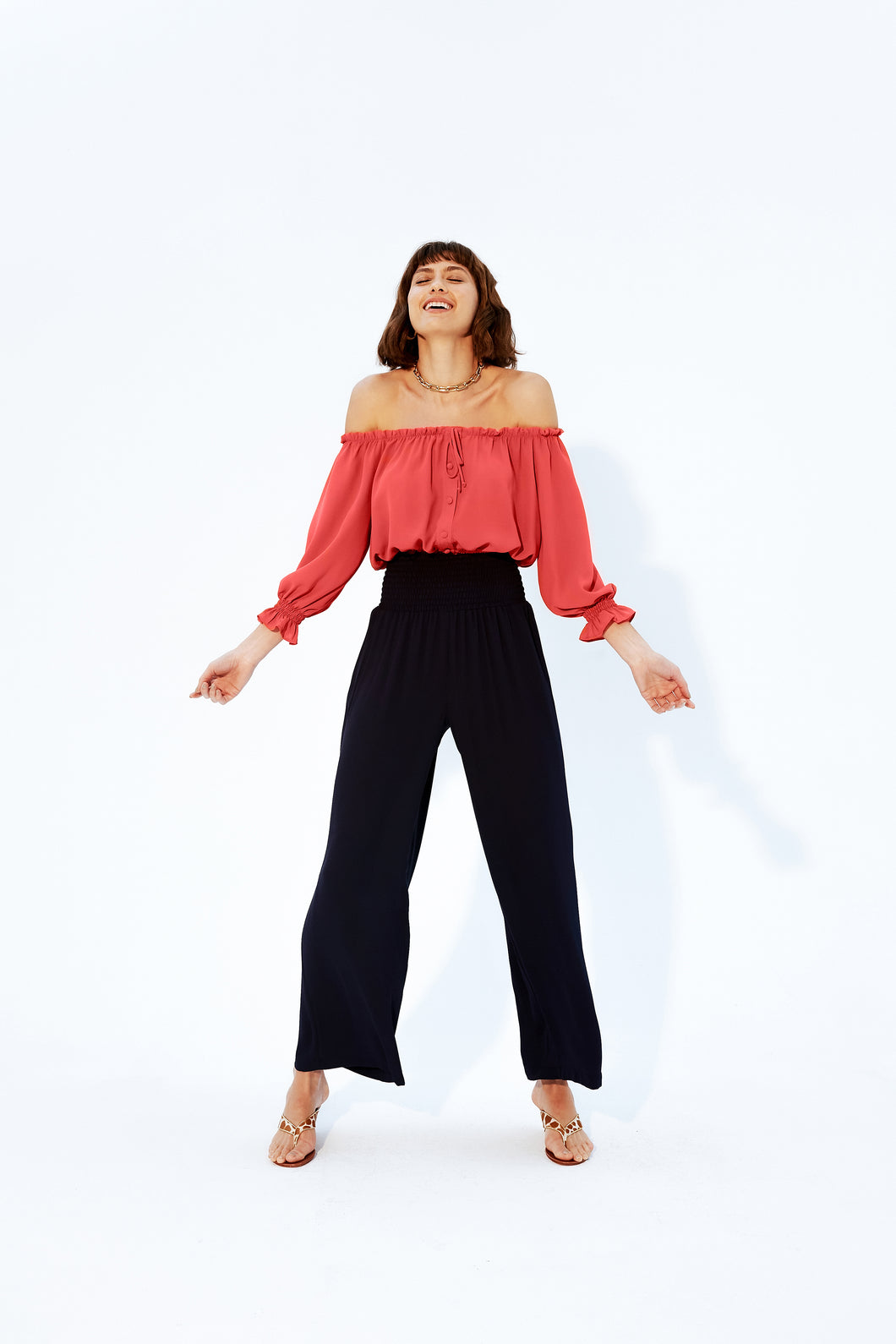 A Blusa Maya, modelo "ciganinha", possui decote ombro a ombro, mangas três quartos com detalhes de lastex e babado. Fita ajustável no decote, botões aplicados na parte da frente e elástico na barra. Confeccionada em crepe com caimento "soltinho".