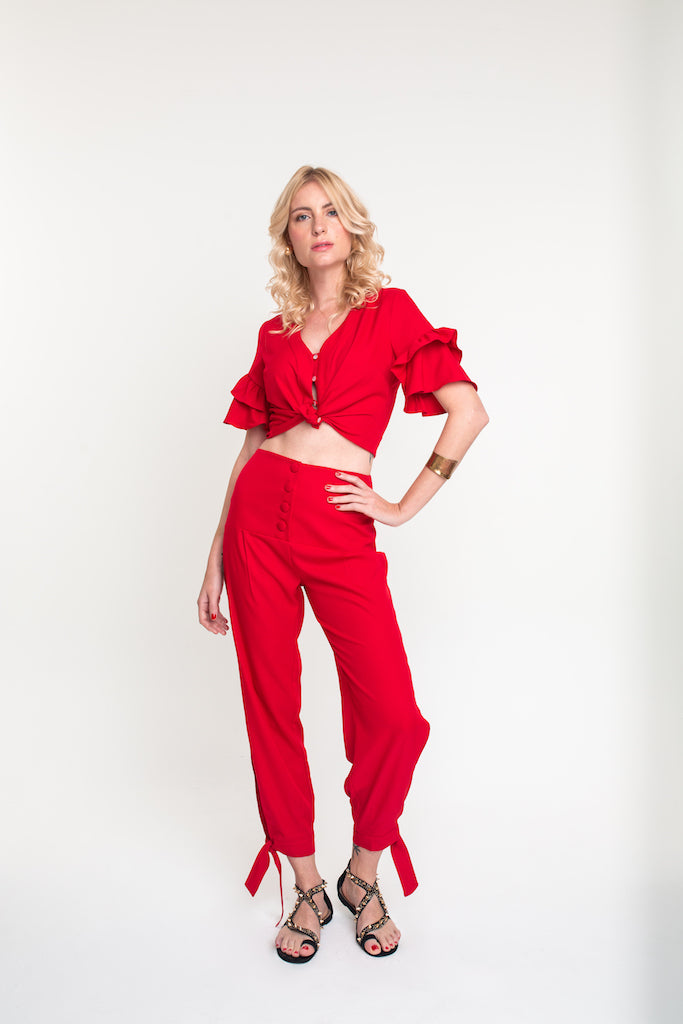 Confeccionada em crepe, a blusa Miranda possui botões perolados na parte da frente e babados nas mangas.
