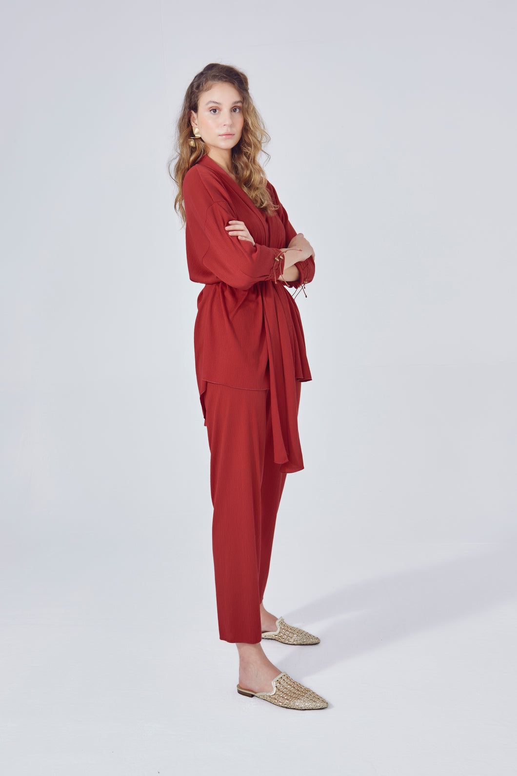 A Calça Ada, confeccionada em malha, tem modelagem de cintura alta, corte reto com a barra afunilada e cós de elástico com cintura ajustada por cordão com regulador de metal.