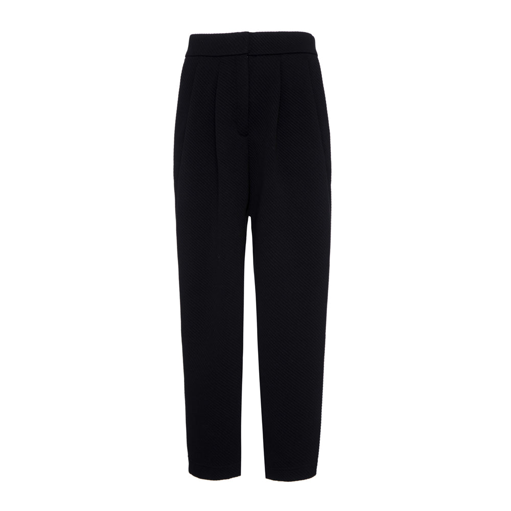 A Calça Alexandra, confeccionada em malha matelassé, possui modelagem ajustada ao corpo, cintura alta, fechamento frontal por zíper invisível e colchete interno e pregas frontais abaixo da cintura.