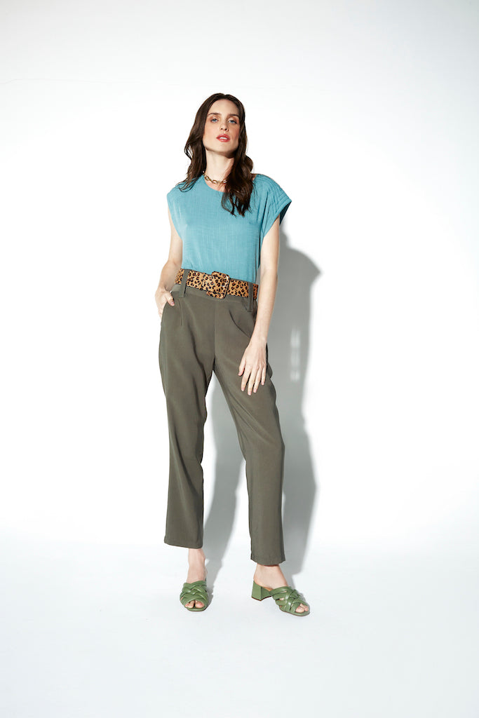 A Calça Cora possui modelagem de cintura alta com passantes na cintura, fechamento lateral por zíper invisível e caimento reto. Confeccionada em sarja.