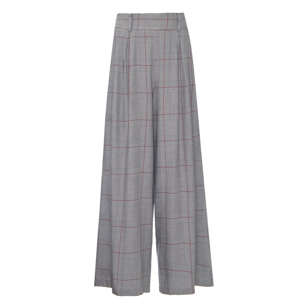 A calça pantalona Cybele possui cintura alta com fechamento lateral por zíper invisível, bolsos laterais e aplicação de passantes. Confeccionada em viscose com estampa Xadrez Príncipe de Gales apresenta prega central na parte da frente.