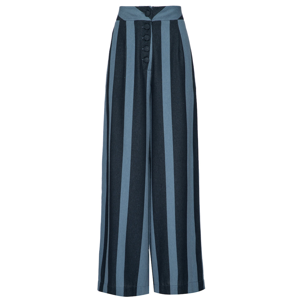 A Calça pantalona Eva, confeccionada em tecido Jeans com listras, possui modelagem de cintura alta e fechamento frontal com botões forrados no mesmo tecido.
