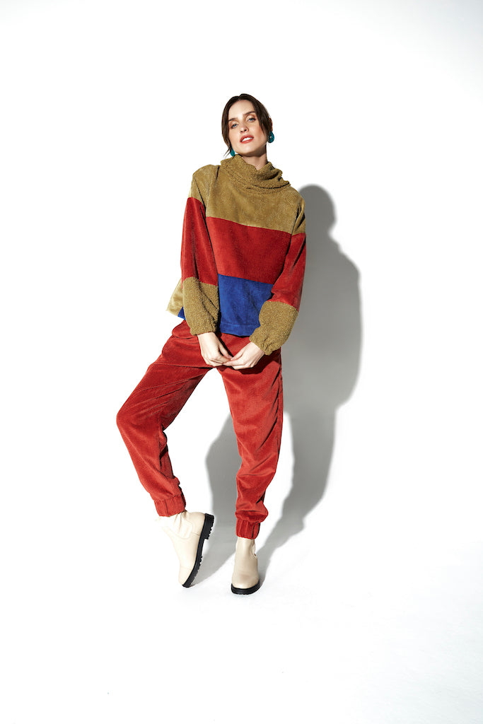 A calça de veludo Flora possui modelagem de cintura alta, cós de elástico, bolsos laterais e elástico na barra