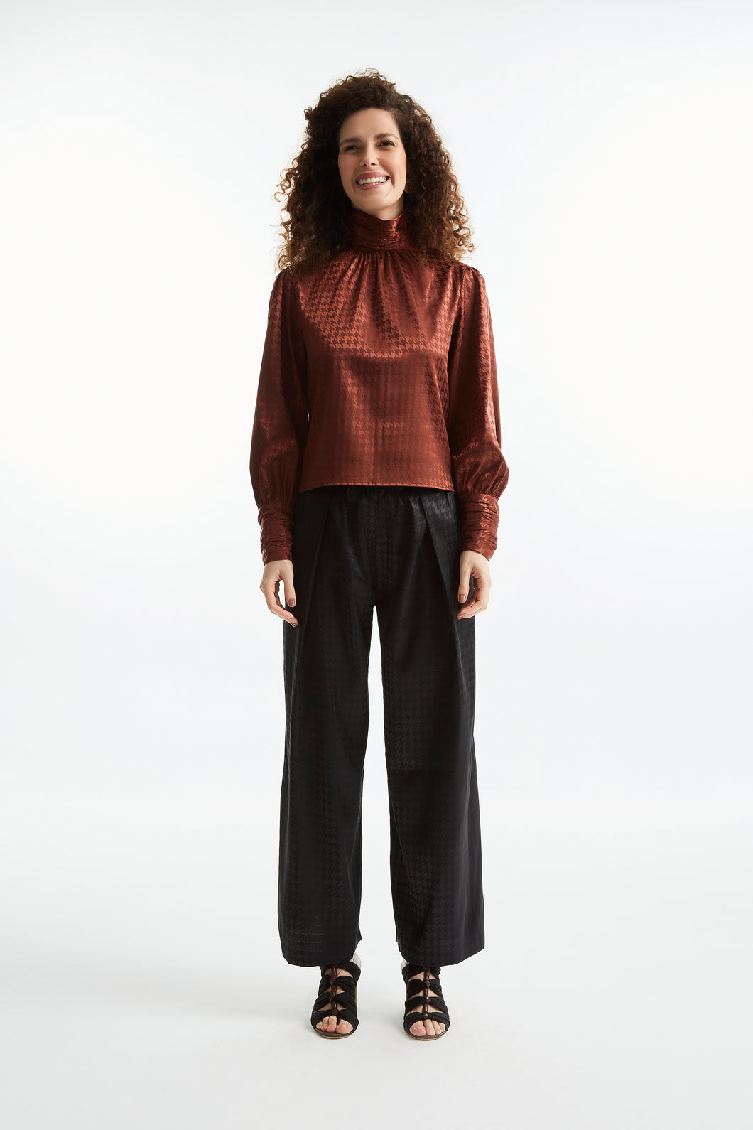 A calça Lívia possui modelagem de cintura alta ajustada com elástico e prega central na parte da frente. Confeccionada em cetim com estampa "Pied de Poule".