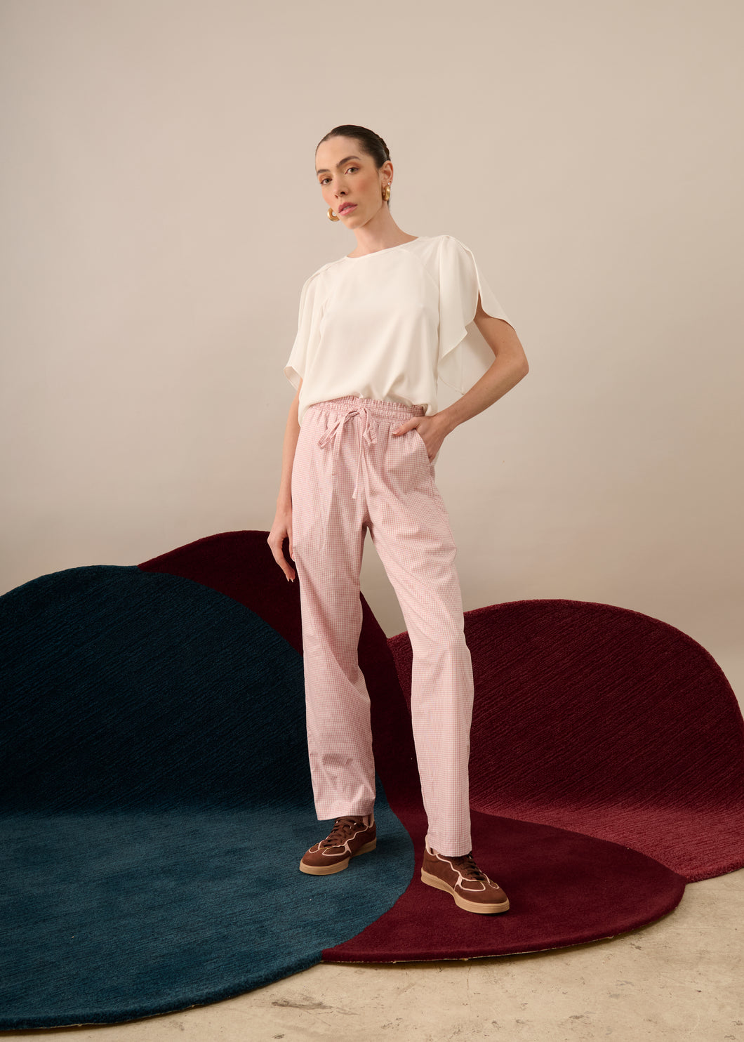 Confeccionada em tricoline, a Calça Mabel apresenta caimento leve e toque confortável. A modelagem reta com pernas amplas garante fluidez ao vestir, enquanto o cós com elástico e amarração proporciona ajuste prático e versátil.