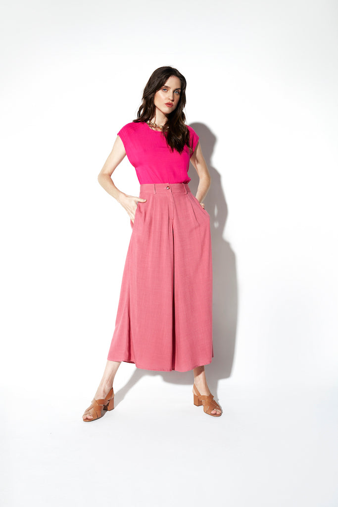 A calça Mel, modelo “pantacourt”, é confeccionada em viscose. Com silhueta de pantalona, esse modelo possui cós alto com passantes e fechamento por zíper invisível e botão. Apresenta pregas frontais e bolsos nas laterais.