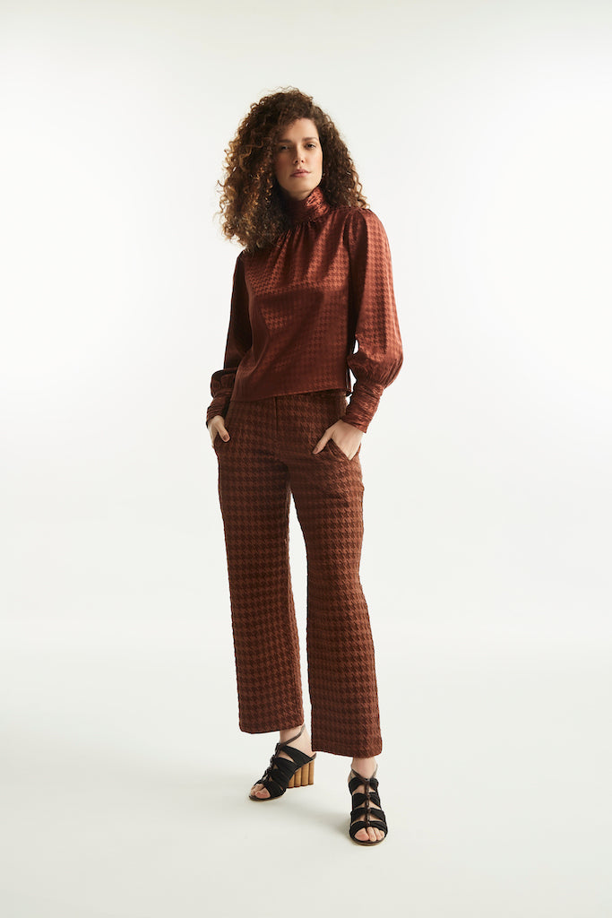 A Calça Vitória possui modelagem de cintura alta, passantes, fechamento frontal por zíper invisível e botão forrado. Este modelo de silhueta reta é confeccionado em tecido estruturado com estampa "Pied de Poule".
