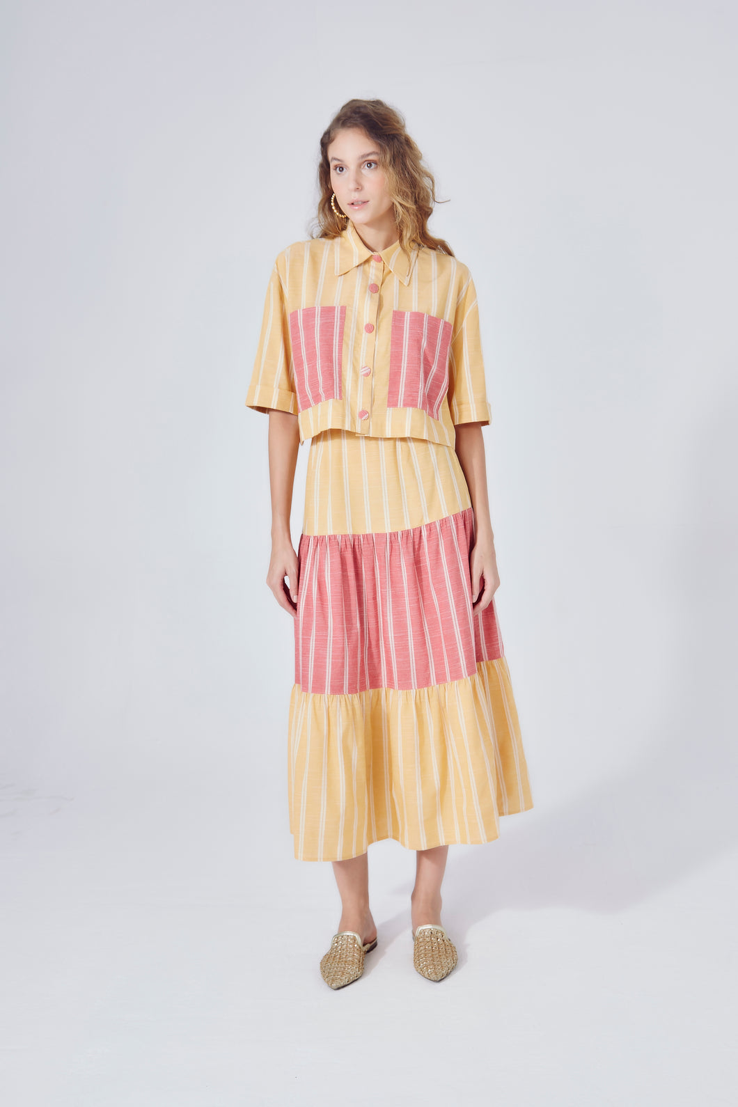 A Camisa Chiara, confeccionada em algodão, possui modelagem ampla com comprimento cropped, bolsos frontais e fechamento frontal por botões forrados.