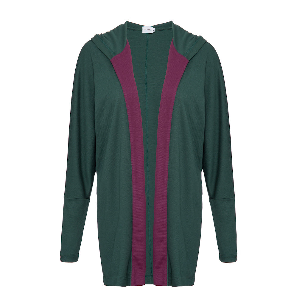 O Casaco Lídia tem comprimento midi, decote arredondado, capuz e mangas longas. Confeccionado em moletom texturizado, possui caimento leve e toque macio.