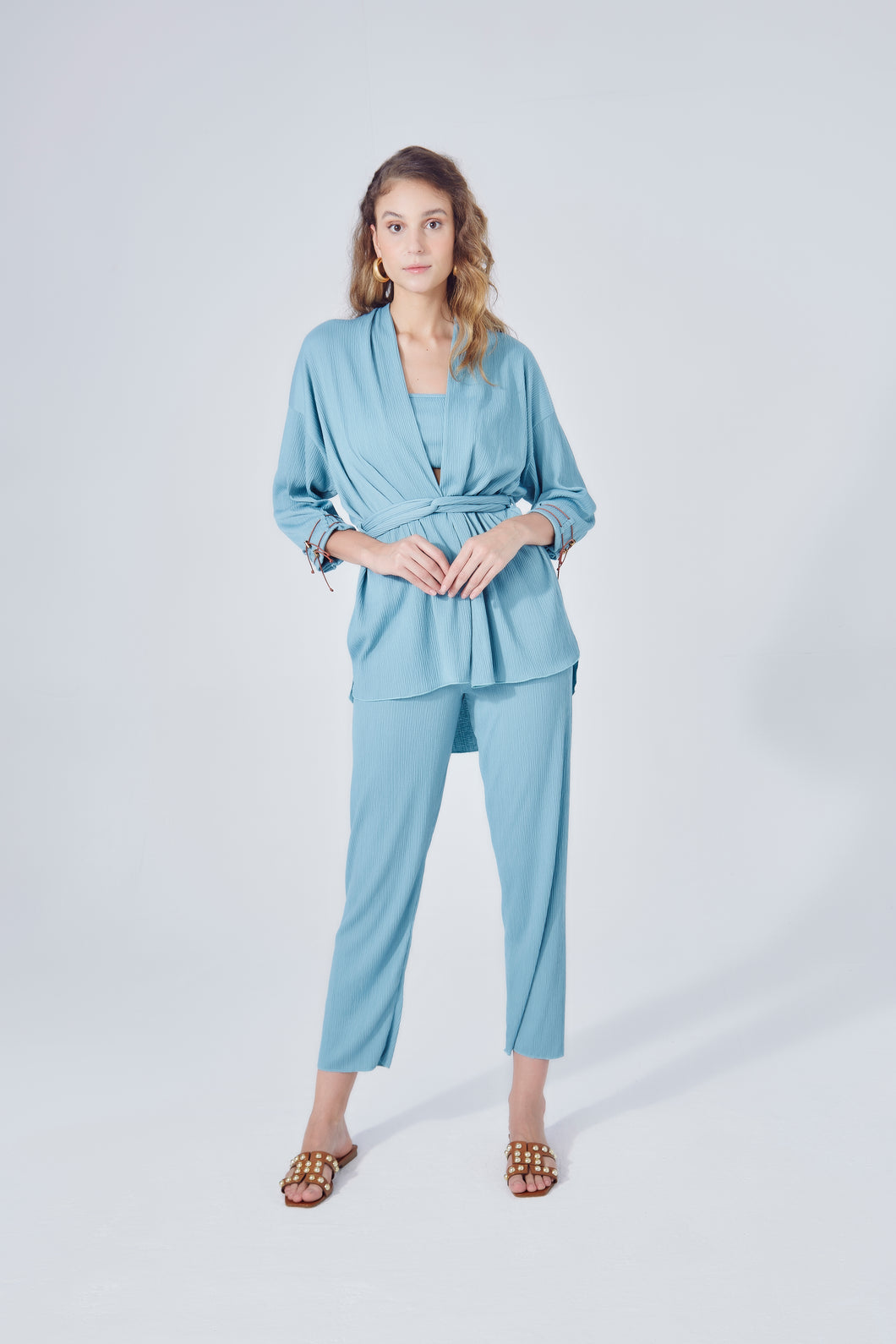 O Kimono Ada, confeccionado em malha, possui faixa ajustável na cintura, mangas amplas e longas que podem ser ajustadas com cordões, fenda nas laterais e barra arredonda mais comprida na parte posterior.