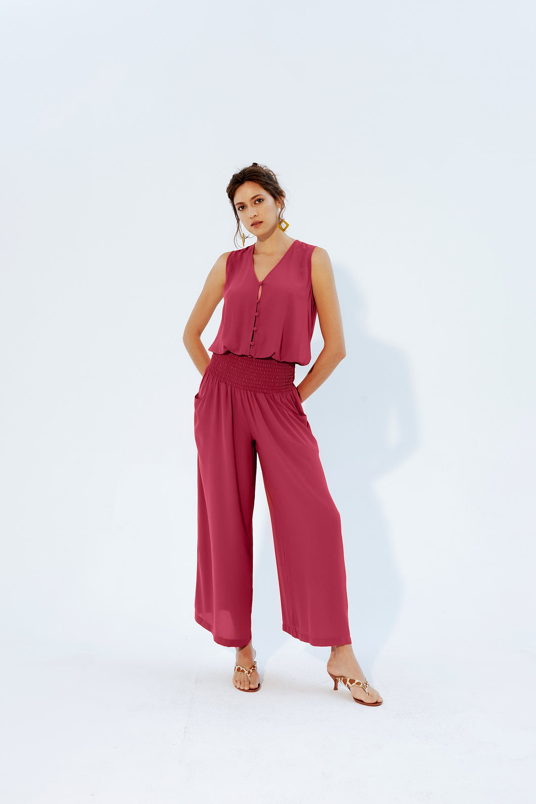 O Macacão Luma, confeccionado em crepe, possui decote "v" transpassado com fechamento em botões forrados, lastex aplicado na cintura e bolsos frontais.