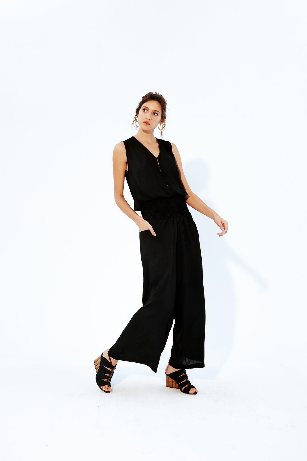 O Macacão Luma, confeccionado em crepe, possui decote "v" transpassado com fechamento em botões forrados, lastex aplicado na cintura e bolsos frontais.