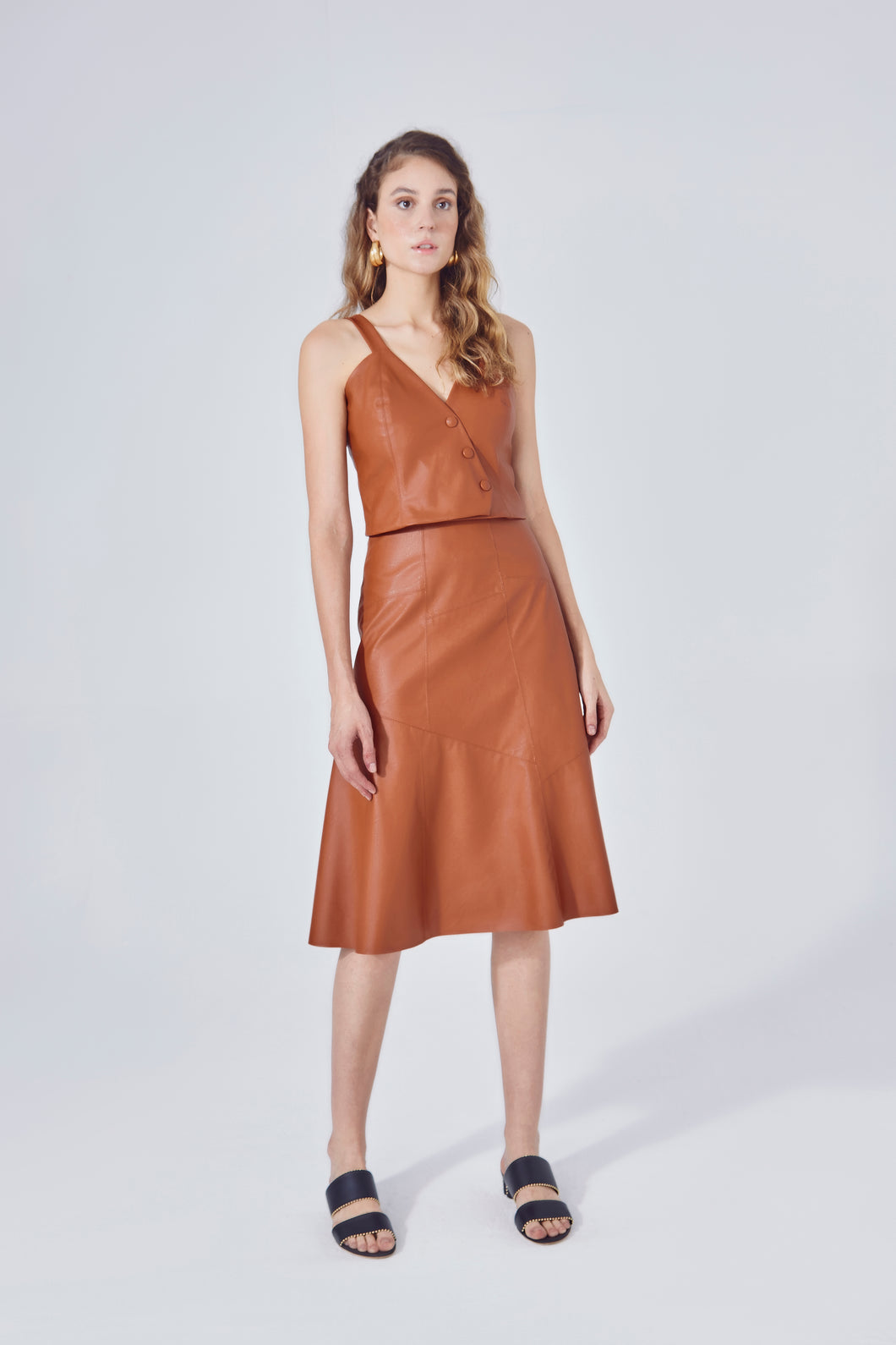 A saia Esther, confeccionada em couro ecológico, apresenta modelagem godê, cintura alta, comprimento midi e recortes com detalhes prespontados. Fechamento posterior por ziper invisível.