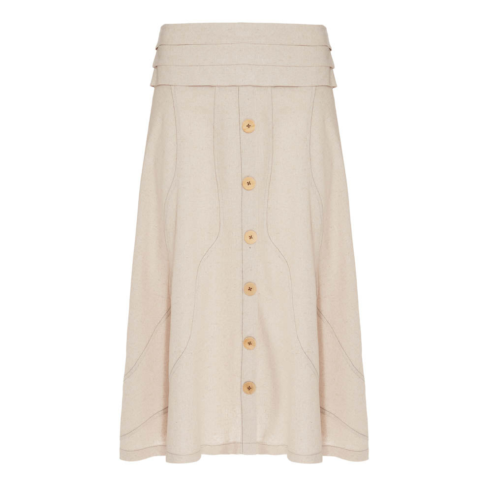A Saia Joana possui caimento soltinho, modelagem evasê de cintura alta com detalhes de friso na pala. Recortes desenhados e botões de madeira em todo comprimento na parte da frontal. Fechamento lateral por zíper invisível. Confeccionada em linho
