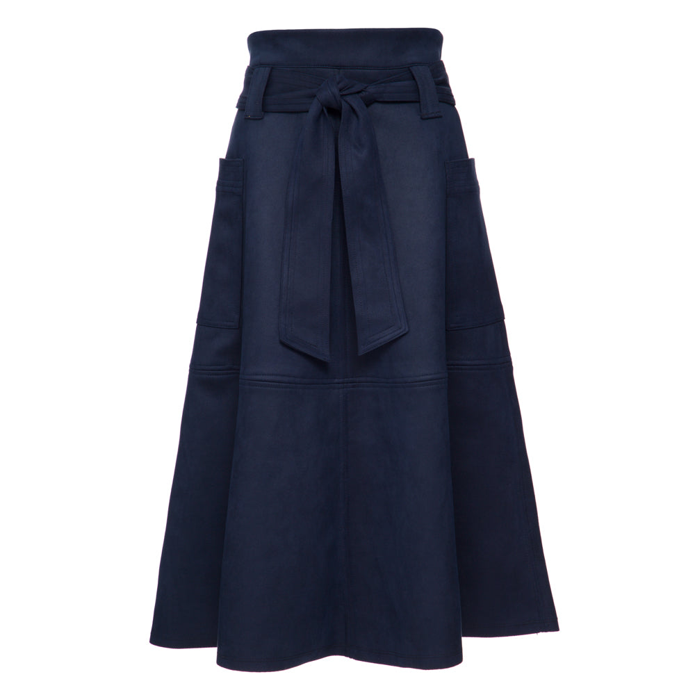 A Saia Lorena, confeccionada em suede, apresenta modelagem godê, cintura alta, comprimento midi, bolsos laterais, detalhes em presponto e fechamento posterior por zíper invisível. Faixa ajustável na cintura no mesmo tecido.
