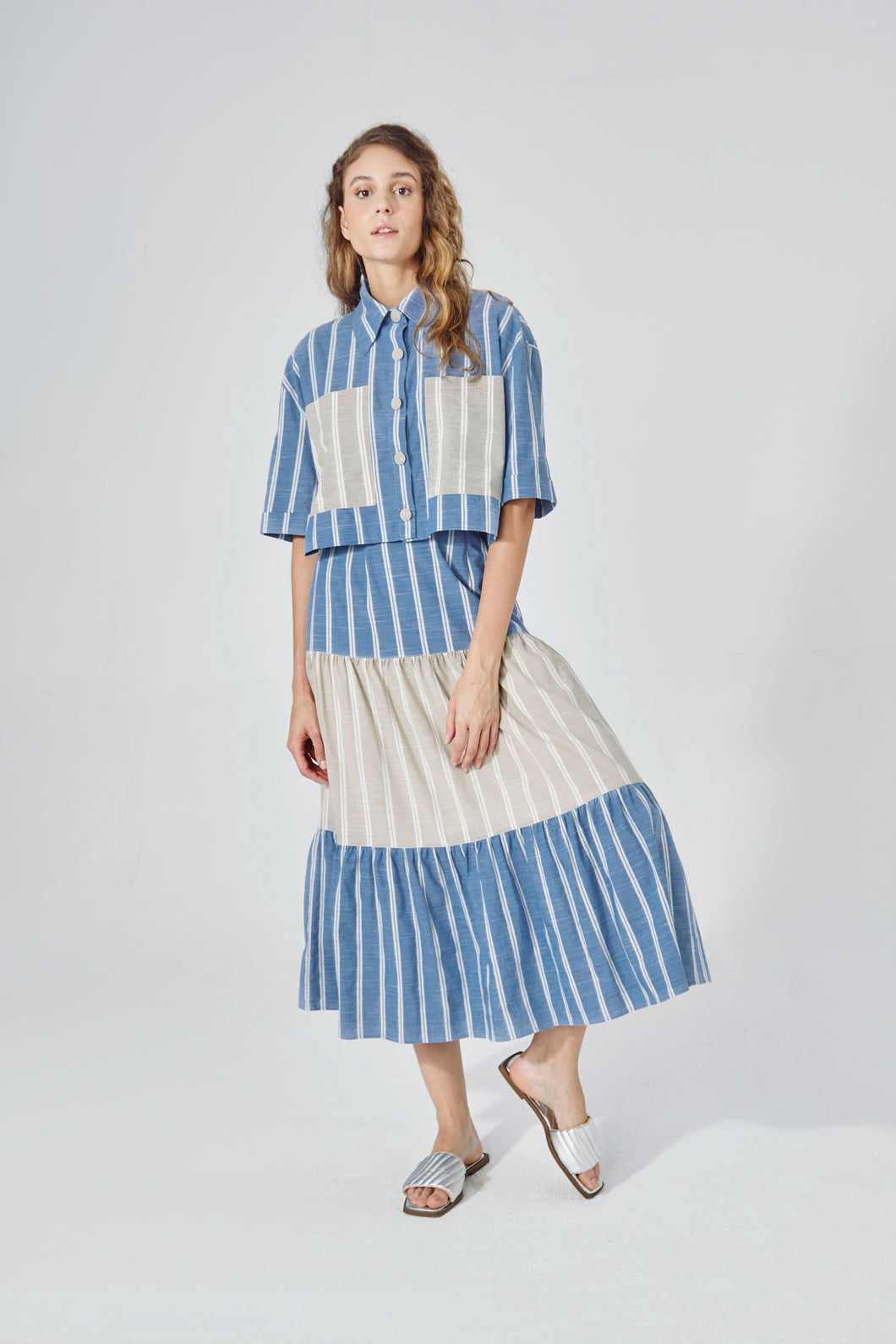 A Saia Olívia, confeccionada em algodão, possui modelagem evasê com recorte pregueado, comprimento longo e fechamento lateral por zíper invisível.