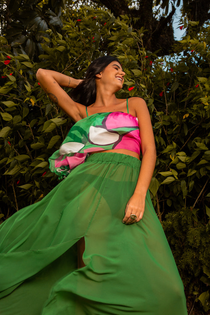 Para compor o look praia nada óbvio, a saia Trancs é a melhor opção. Transparente e longa, em corte godê, ela possui uma fenda frontal. Perfeita para usar por cima do biquíni e se divertir durante o dia ou, para compor um look festa com um body ou uma hotpants.