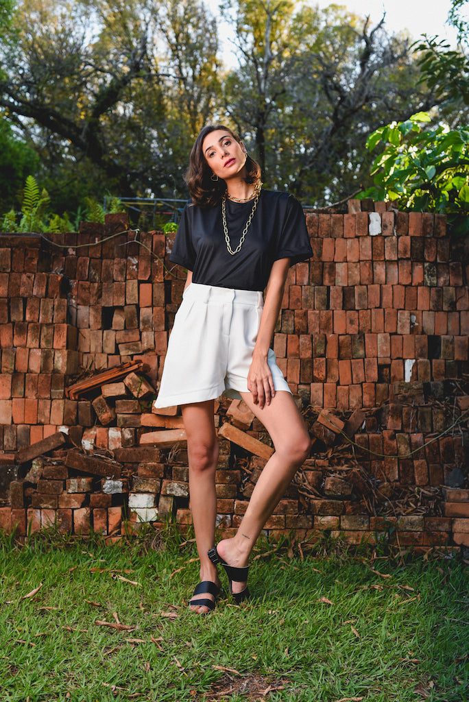 A t-shirt Nana, confeccionada em tecido de malha, possui modelagem de mangas curtas oversized com caimento "soltinho".