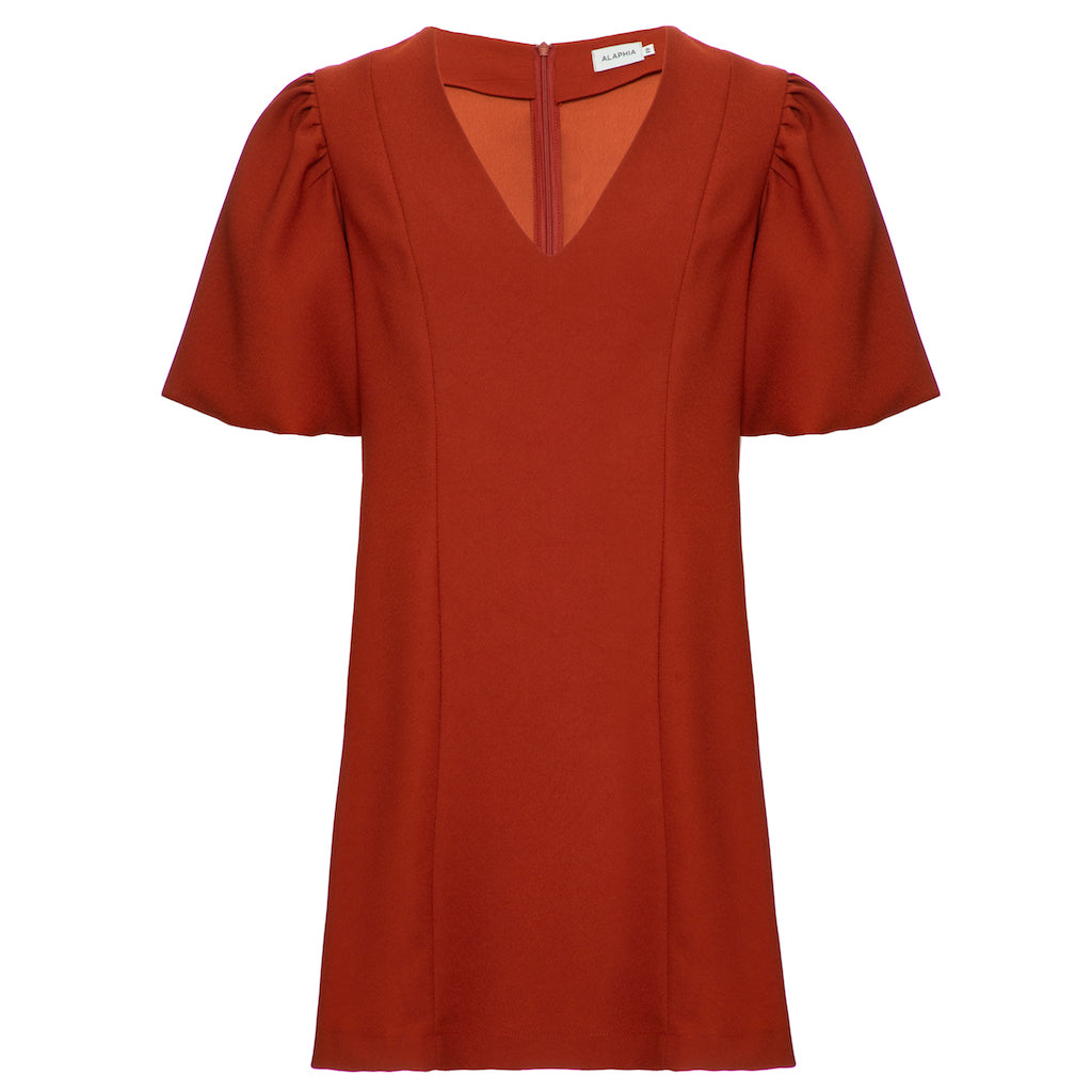 O vestido Aisha, confeccionado em crepe, possui decote "V", mangas curtas bufantes e comprimento acima do joelho. Fechamento posterior por zíper invisível.