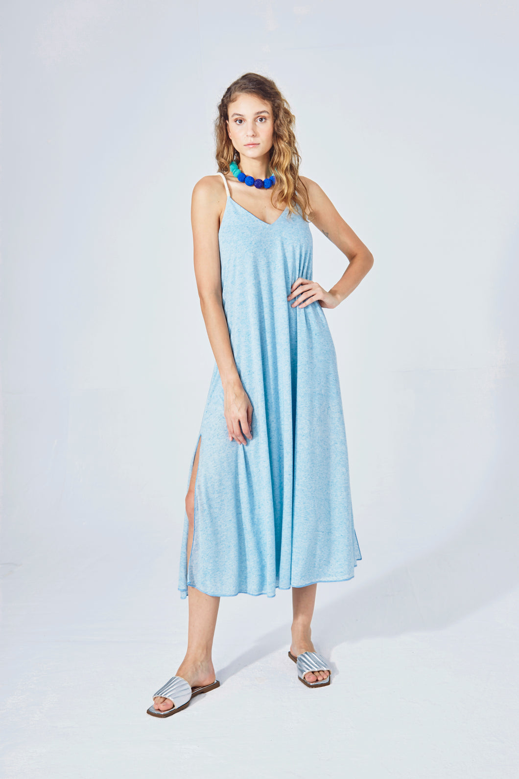 O Vestido Kyra possui comprimento longo com modelagem evasê. Caimento fluído com decote levemente em “v” e fendas laterais. Alças em corda na cor cru com acabamento em miçanga.