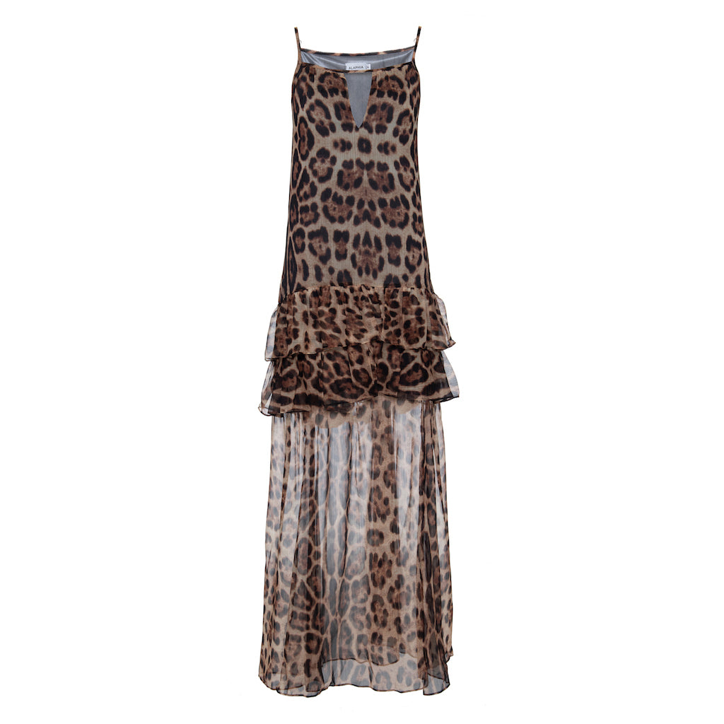 O Vestido Leopard, confeccionado em tecido fluido com estampa Animal Print, possui comprimento longo com fendas frontais e posteriores e decote V com alças finas. Detalhe de babado abaixo da cintura.