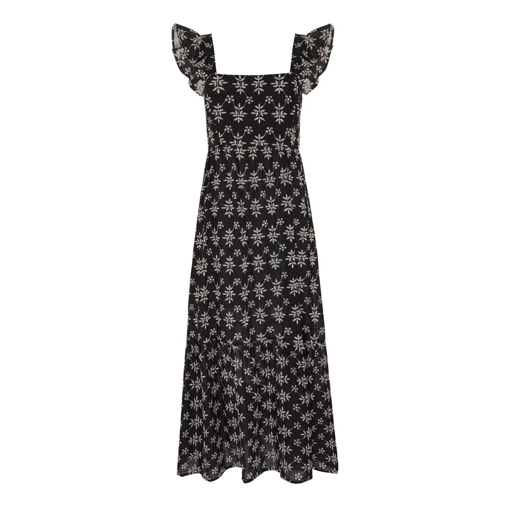 O vestido Nat, confeccionado em tecido de algodão bordado, possui decote reto, alças médicas com babados e recortes com leves pregas em seu comprimento. Comprimento longo, possui forro.