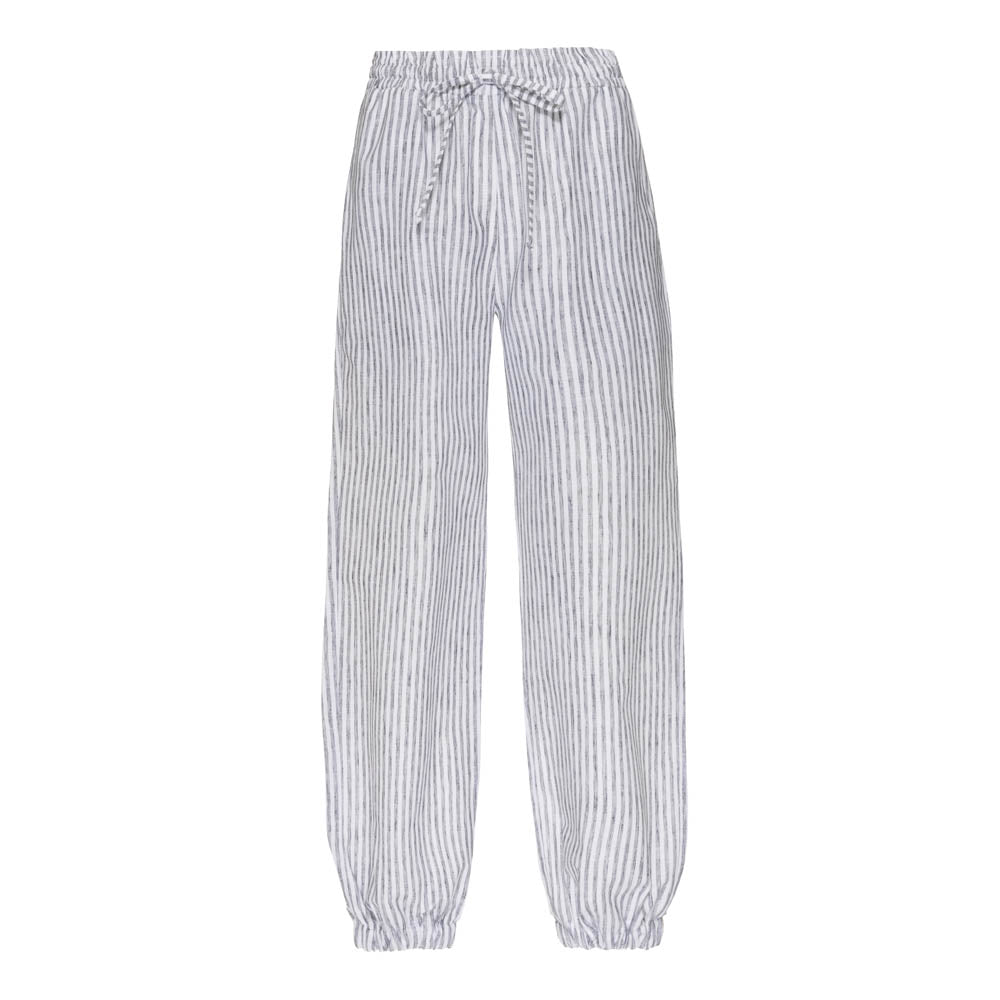 A calça Simona, confeccionada em tecido misto de algodão, possui modelagem cenoura, cós com elástico e cordão para amarração, bolsos frontais e posteriores e elástico na barra.