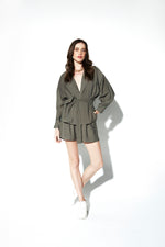 O Kimono Cora, confeccionado em sarja, possui faixa ajustável na cintura e passantes, mangas amplas longas com pregas e punhos afunilados.