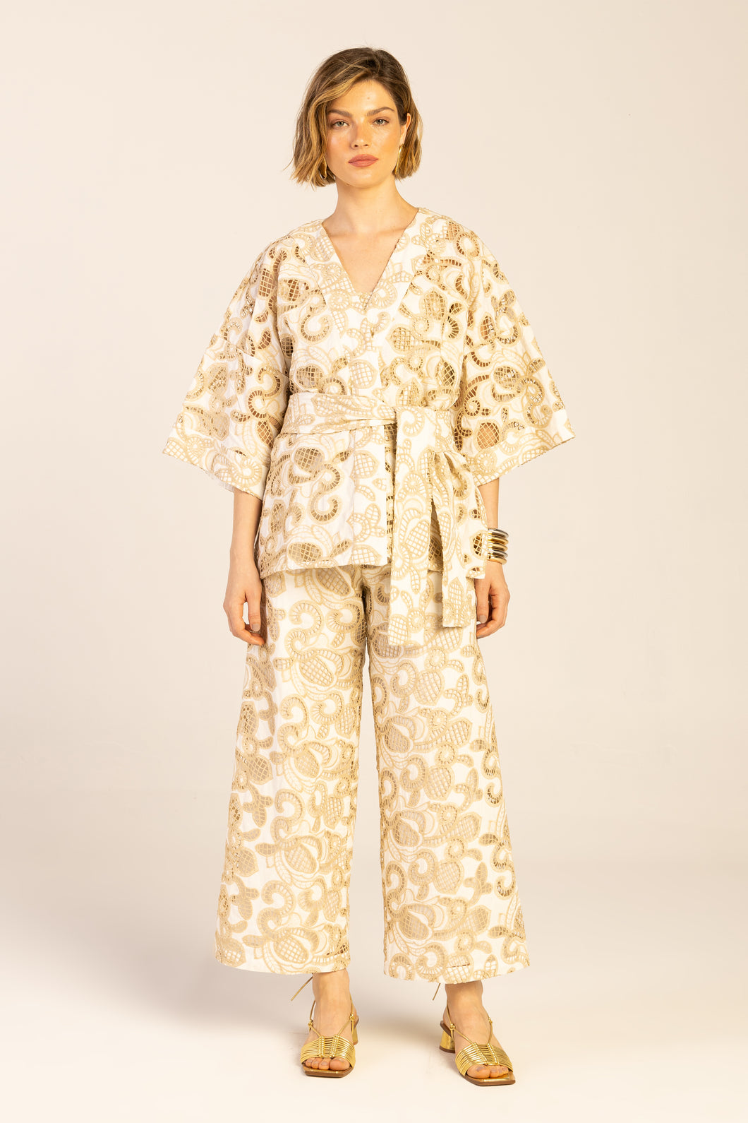 O Kimono Verona, confeccionado em um delicado tecido de algodão e linho bordado, que traz um toque artesanal ao design. Com caimento solto e recorte na barra, essa peça proporciona liberdade de movimento, as mangas oversized asseguram o conforto e conferem um visual contemporâneo.