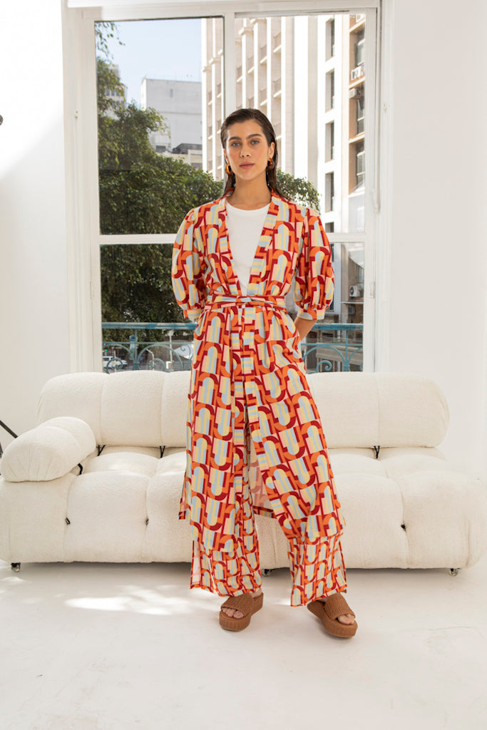 Acompanha faixa no mesmo tecido para ajuste na cintura, permitindo diferentes formas de uso — desde looks descontraídos até produções mais elaboradas. Uma peça marcante, pensada para transitar em diferentes propostas de produção.