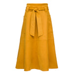 A Saia Lorena, confeccionada em suede, apresenta modelagem godê, cintura alta, comprimento midi, bolsos laterais, detalhes em presponto e fechamento posterior por zíper invisível. Faixa ajustável na cintura no mesmo tecido.