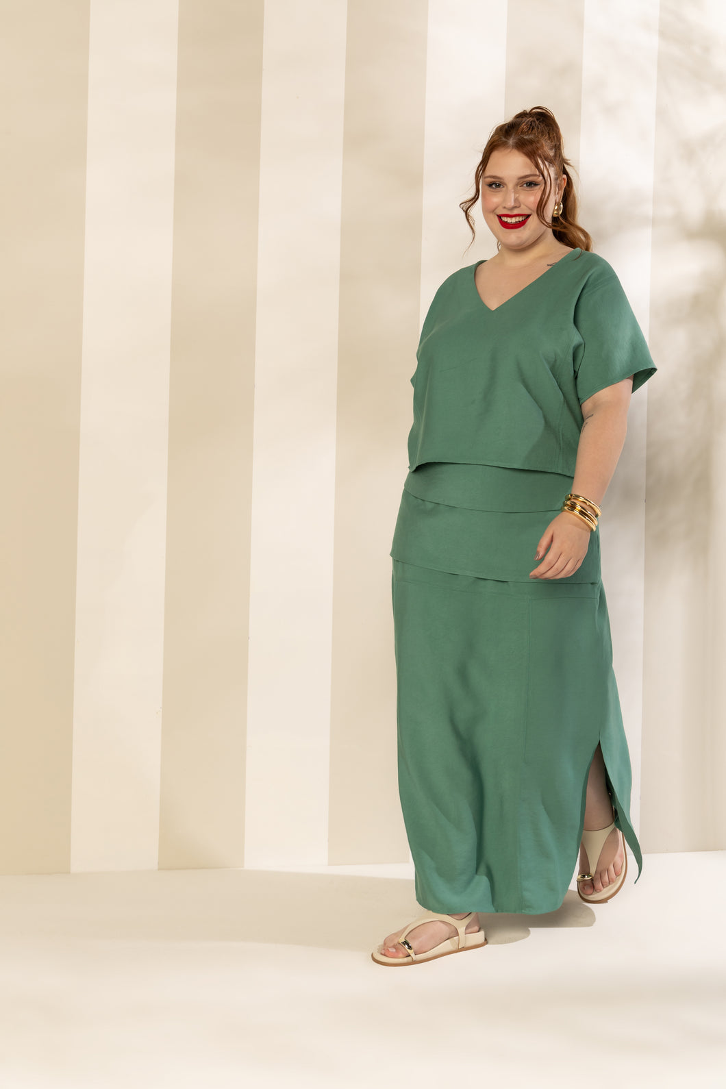 A saia Roma, confeccionada em viscose, possui modelagem de cintura alta com pala sobreposta, recortes e fendas laterais. Fechamento por zíper invisível na lateral e elástico na cintura na parte posterior. Este modelo apresenta bolsos na parte posterior.