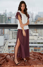 Para compor o look praia nada óbvio, a saia Trancs é a melhor opção. Transparente e longa, em corte godê, ela possui uma fenda frontal. Perfeita para usar por cima do biquíni e se divertir durante o dia ou, para compor um look festa com um body ou uma hotpants.