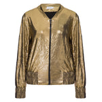 A Bomber Gold apresenta modelagem de mangas longas e fechamento por zíper de metal com elástico na barra e nas mangas. Confeccionada em tecido de malha leve, metalizada com efeito “amassado”, não possui forro.