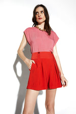 O shorts Cora, confeccionado em sarja, possui modelagem de cintura alta com passantes na cintura, pregas frontais, fechamento lateral por zíper invisível e caimento reto.