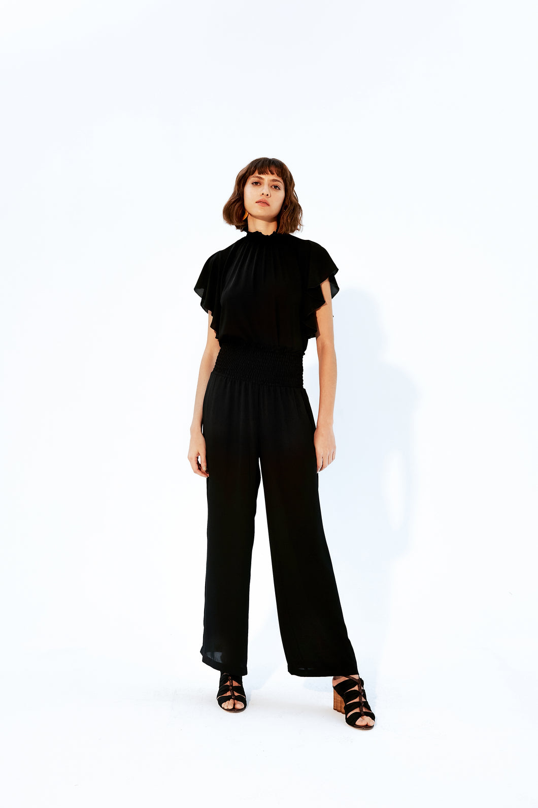 A Blusa Allana, possui gola alta com recorte posterior vazado com lastex aplicado e detalhamento de babado. Modelagem de mangas curtas e amplas, com caimento reto e fechamento posterior por botões forrados. Confeccionada em crepe.