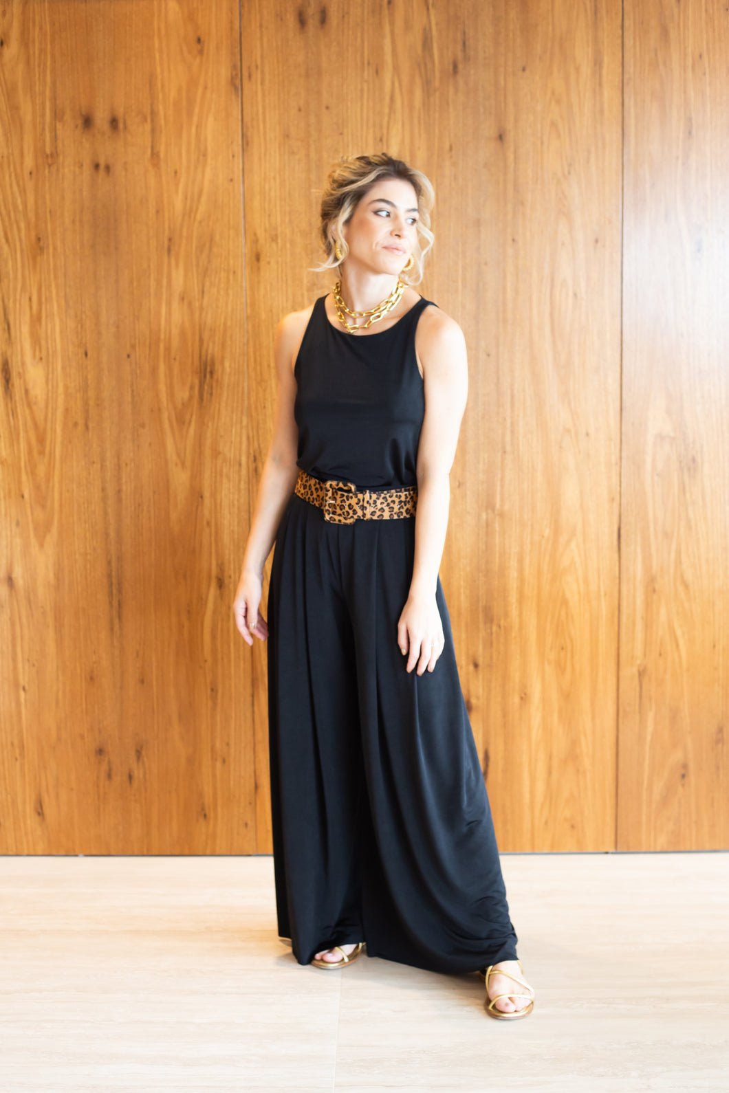 A calça Alice, confeccionada em jersey, possui modelagem pantalona com cintura alta ajustada com elástico. Este modelo possui prega na parte frontal.