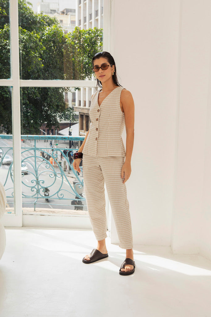 Com shape de cintura alta e caimento estruturado com barra afunilada, a Calça Claire une sofisticação e praticidade. O zíper para fechamento lateral e os bolsos posteriores traduzem o equilíbrio entre design e funcionalidade. Uma peça que se adapta a diferentes ocasiões com leveza e autenticidade.