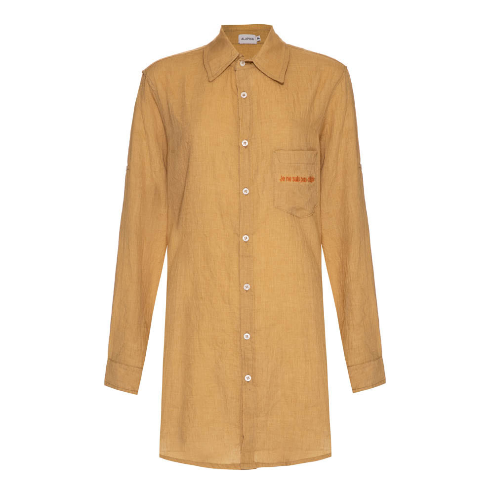 Camisa oversized com modelagem de mangas longas com botão aplicado nos punhos, ombros estendidos, colarinho clássico, shape solto e caimento reto. Fechamento frontal por botões e bolso aplicado no lado esquerdo na altura do busto com frase bordada "Je ne suis pas obligée".