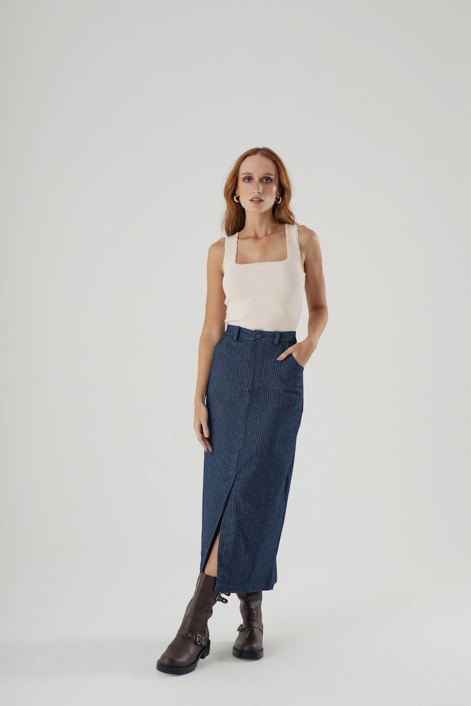 A regata Amalfi, confeccionada em tricô, possui alças largas, caimento ajustado ao corpo e decote arredondado.