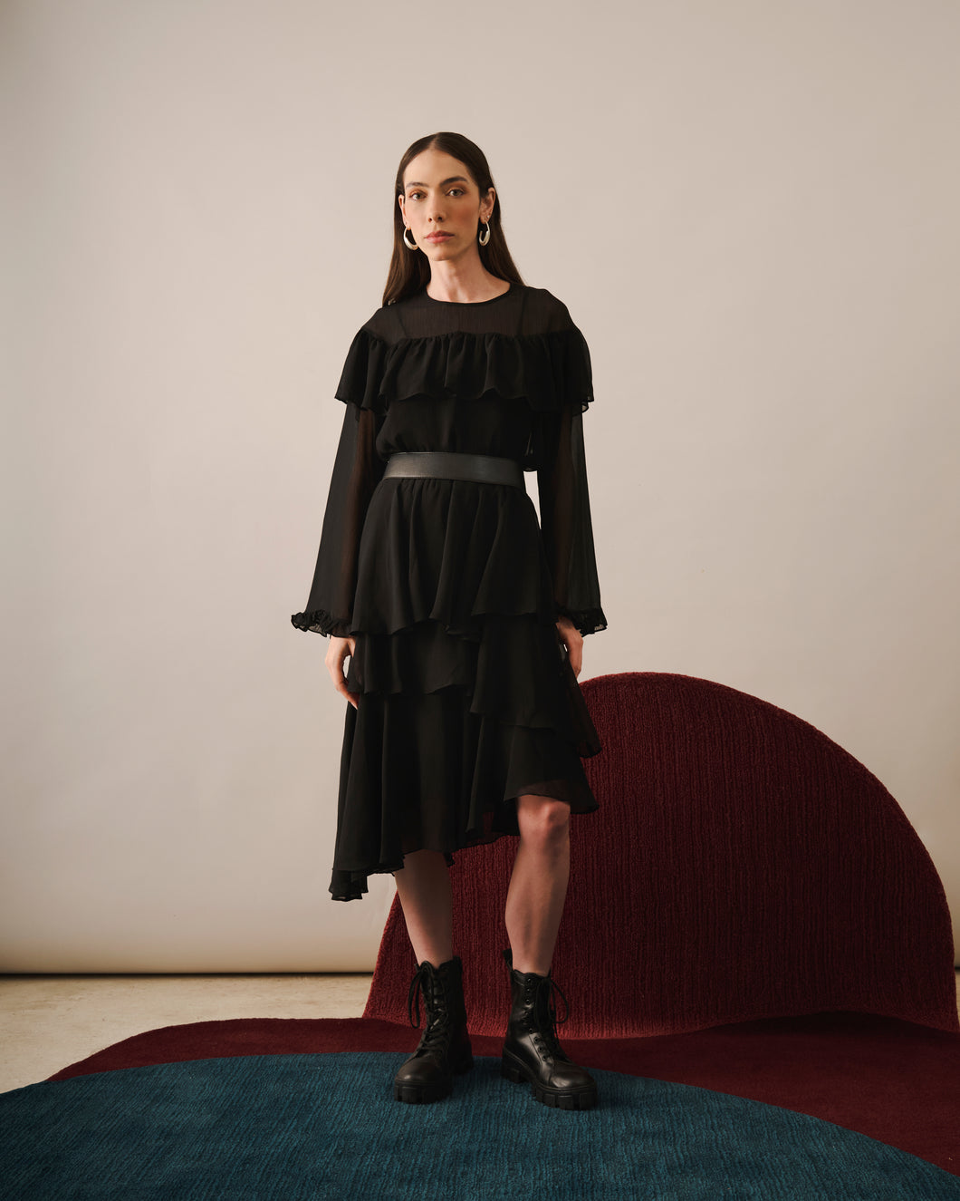 O modelo apresenta babados aplicados na região do busto e nos punhos, criando volume suave e trazendo dimensão ao design. O acabamento em frufru reforça o caráter feminino da peça e adiciona textura ao contorno dos detalhes.