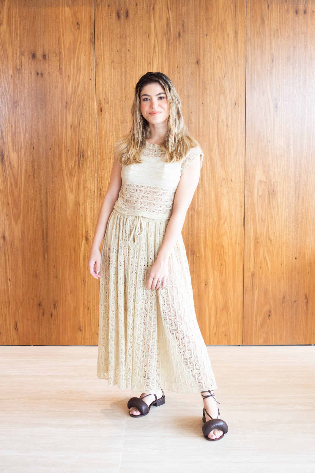 A Blusa Juliana, confeccionada em crochê, possui decote careca, caimento "soltinho", alças cavadas e comprimento cropped.
