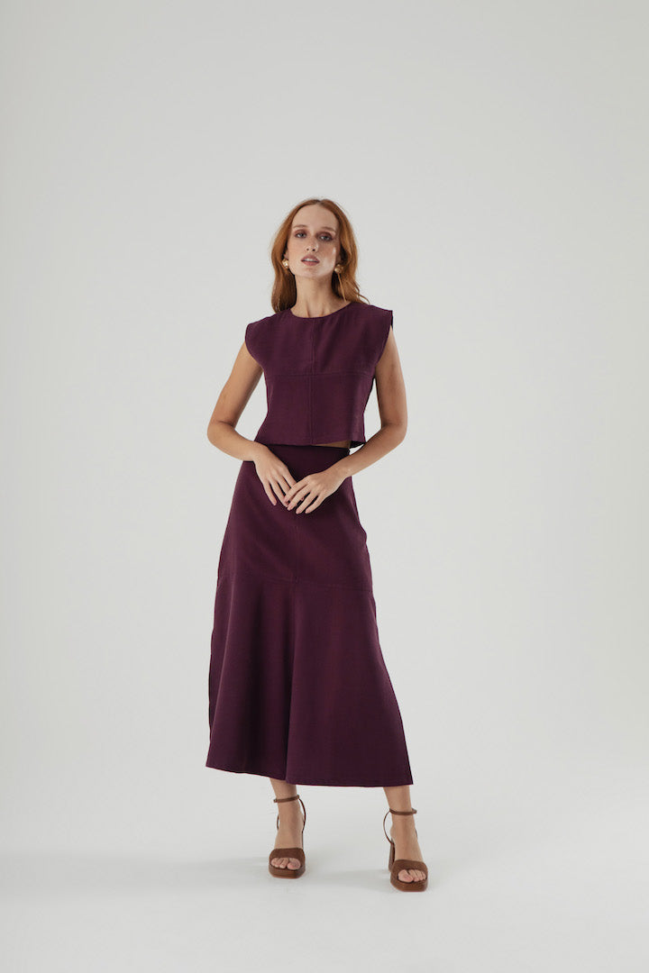 A Blusa Lapa, confeccionada em viscose, possui caimento solto, gola careca, com fechamento posterior e detalhes de recortes geométricos pespontados. Este modelo não possui mangas.