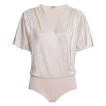 O Body Samantha traz um ar de sofisticado para qualquer produção. Produzido em tecido brilhante plissado, o lamé; com decote V e manga curta.  Sua calcinha foi desenvolvida em tecido sem costura que não marca o corpo.