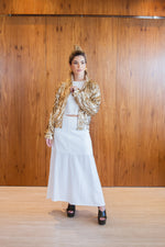 A bomber Guilhermina, confeccionada em paetê com acabamento fosco, possui modelagem de mangas longas com fechamento frontal por zíper, bolsos laterais e elástico nos punhos e na barra. Este modelo possui forro.