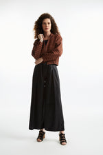 A Bomber Marcela possui modelagem de mangas longas e fechamento frontal por zíper de metal com elástico na barra e nos punhos. Confeccionada em tecido estruturado com estampa "Pied de Poule", este modelo possui bolsos na parte da frente.