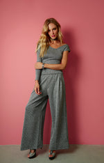 A calça pantalona Icon possui cintura alta ajustada com elástico. Confeccionada em tecido brilhante de malha listrada prata e preta, tem prega central na parte da frente. Ideal para produções mais elaboradas, seja de dia ou a noite.