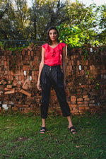 A Calça Marina tem modelagem de cintura alta, com pregas frontais, cós com passantes e fechamento por zíper e botões de pressão. Possui detalhe de botão na barra.